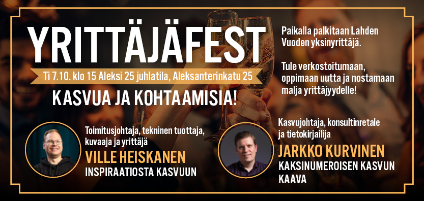 Lahden Yrittäjäfest kokoaa jälleen yhteen alueen yrittäjät rennon verkostoitumisen, mielenkiintoisten puheenvuorojen sekä Lahden Vuoden Yksinyrittäjän palkitsemisen merkeissä. Tänä vuonna juhlan kattoteemana on kasvu ja sen monet muodot.