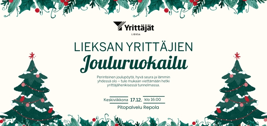 Tapahtuma on suunnattu Lieksan Yrittäjien jäsenille ja heidän aveceilleen. Jouluruokailu on jäsenelle maksuton, avecille ja ei-jäsenille 20 €. Ruokailu maksetaan Lieksan Yrittäjät ry:lle, tilinumero FI91 5343 0720 0842 71. Ilmoittaudu mukaan 7.12. mennessä.