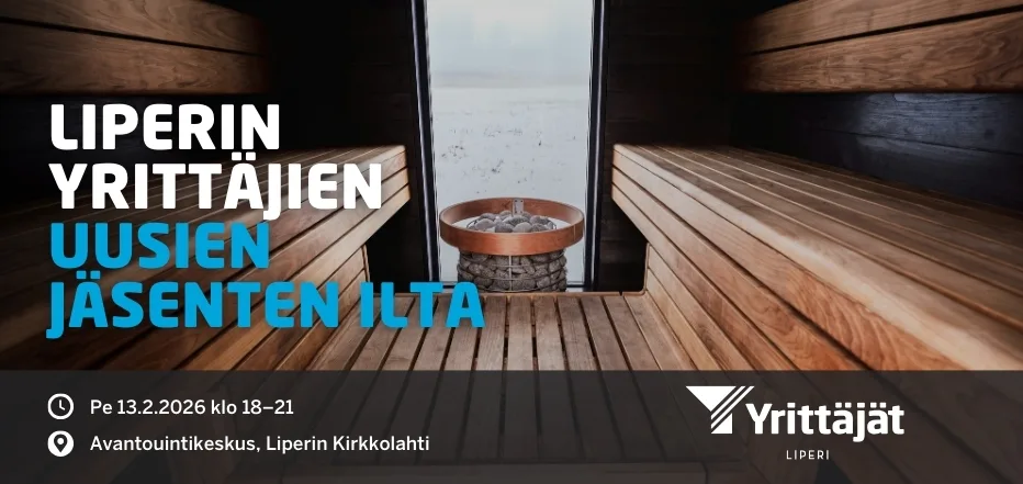Tervetuloa tutustumaan muihin yrittäjiin, kuulemaan mitä jäsenyys tarjoaa ja viettämään rentoa iltaa perjantaina 13.2.2026 Liperin avantouintikeskuksella kanssayrittäjien kanssa. Illan kruunaa sauna ja avanto.
