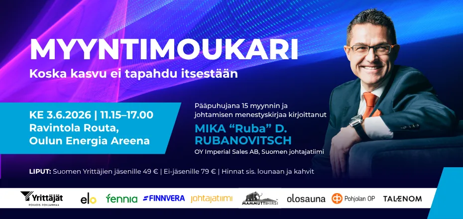 Tervetuloa inspiroivaan yrittäjien myynnin ja kasvun sparraustapahtumaan Oulun Energia Areenan Routabaariin keskiviikkona 3.6.2026 klo 11.15–17.00!