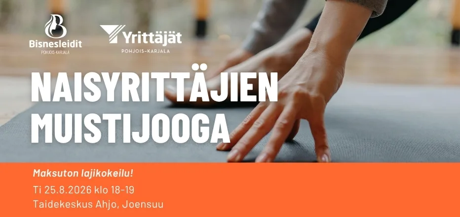 Tapahtuman järjestää Pohjois-Karjalan Yrittäjien naisyrittäjäverkosto Bisnesleidit. Tapahtuma on maksuton ja suunnattu jäsenille: naisyrittäjille sekä yrittäjien naispuolisoille. Mukaan mahtuu 20 osallistujaa. Ota mukaan rento, liikkumiseen sopiva varustus sekä halutessasi vesipullo ja villasukat. Muistijoogamatot löytyvät paikan päältä. Ilmoittaudu viimeistään maanantaina 17.8.