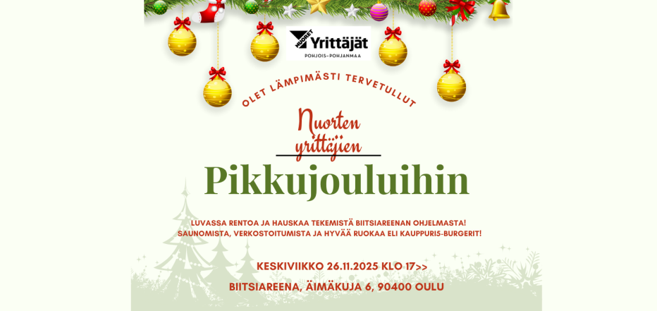 Tule viettämään Nuorten yrittäjien pikkujouluja rennolla meiningillä Biitsiareenalle 26.11. klo 17 eteenpäin!
