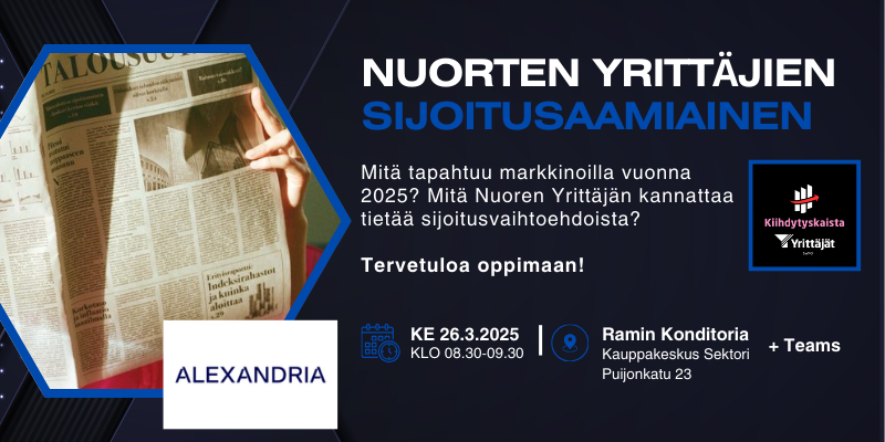Mitä tapahtuu maailmanmarkkinoilla vuonna 2025? Mitä nuoren yrittäjän kannattaa huomioida sijoittamisessa? Oletko nuori yrittäjä, joka haluaa oppia lisää sijoittamisesta ja verkostoitua muiden samanhenkisten kanssa?