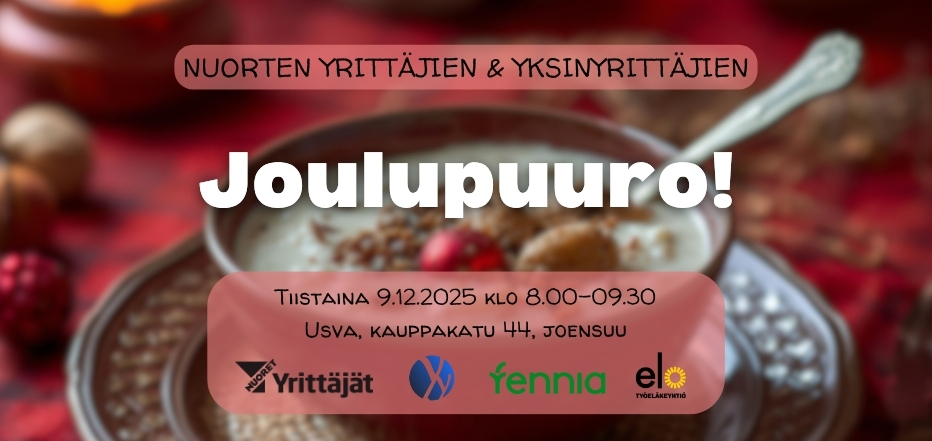 Ilmoittaudu viimeistään 3.12. Tapahtumaa mahdollistamassa Fennia ja Elo, Pohjois-Karjalan Nuoret Yrittäjät ry ja Yksinyrittäjien johtoryhmä Yy-sakki.