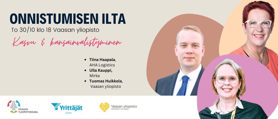 Vaasan yliopistoseura, Vaasan Yrittäjät ja Vaasan yliopisto järjestävät jo kahdeksatta kertaa Onnistumisen illan. Kyseessä on vuosittainen tapahtuma, jossa jokainen voi oppia ja innostua yrityksen tai yrittäjän menestystarinasta eri teemojen kautta. Tällä kertaa illan läpileikkaavana teemana on Kasvu & kansainvälistyminen.