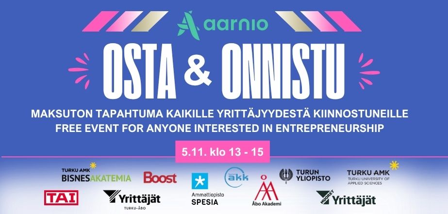Kiinnostaako yrittäjyys? Haluatko ymmärtää, miten yrityksen ostaminen käytännössä toimii? Tule mukaan maksuttomaan Osta & Onnistu -tapahtumaan, keskiviikkona 5.11.2025 klo 13.00-15.00 kuulemaan lisää! Tapahtuma järjestetään Turussa, Lemminkäisenkadun campuksella, Lemminkäisenkatu 30, luentosali (tila A173).