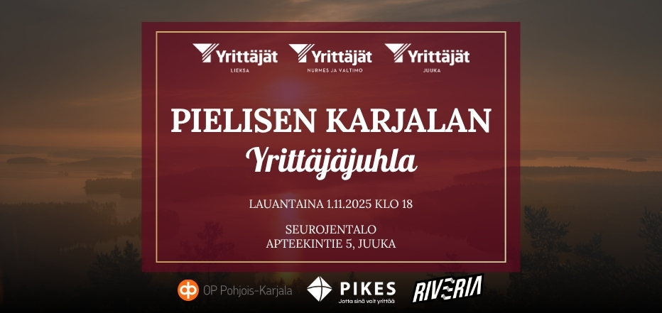 Juuan Yrittäjät, Nurmeksen ja Valtimon Yrittäjät sekä Lieksan Yrttäjät kokoontuvat marraskuussa juhlistamaan yrittäjyyttä, verkostoitumista ja vuoden aikana saavutettuja onnistumisia. Luvassa on arvokas ja lämminhenkinen ilta hyvässä seurassa.