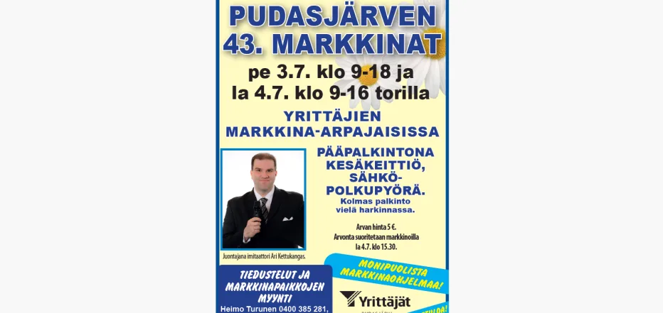 Yrittäjien markkina-arpajaisissa pääpalkintona kesäkeittiö, sähköpolkupyörä. Kolmas palkinto vielä harkinnassa. Arvan hinta 5€. Arvonta suoritetaan markkinoilla la 4.7. klo 15.30.