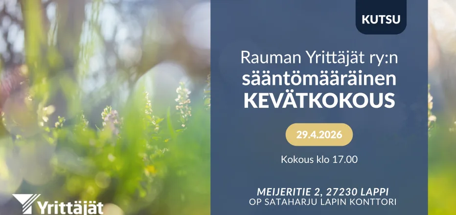Tervetuloa Rauman Yrittäjien sääntömääräiseen kevätkokoukseen keskiviikkona 29.4.2026 klo 16.30 alkaen OP Sataharjun konttorille.