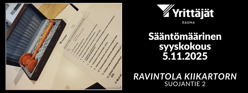 Rauman Yrittäjät ry:n sääntömääräinen syyskokous järjestetään 5.11.2025 klo 18 alkaen.