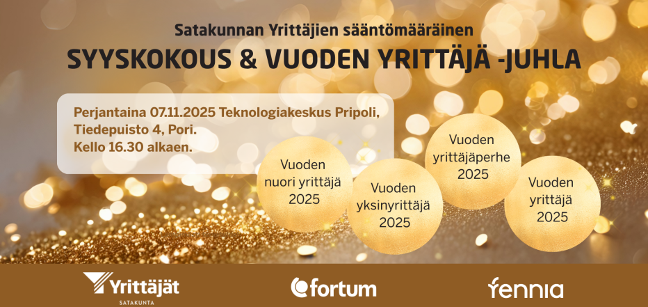 Satakunnan Yrittäjien Syyskokous & Vuoden Yrittäjä -juhla kokoaa alueen yrittäjät ja yhteistyökumppanit yhteen Teknologiakeskus Pripoliin Poriin perjantaina 7.11.2025 klo 16.30 alkaen. Luvassa on inspiroiva ilta, jossa päätetään yhdistyksen tulevista vuoden 2026 linjauksista, palkitaan vuoden menestyjät ja kohotetaan malja yrittäjyyden kunniaksi. Tule mukaan vaikuttamaan, juhlimaan ja verkostoitumaan – tämä on Satakunnan yrittäjävuoden kohokohta, jota et halua jättää väliin!