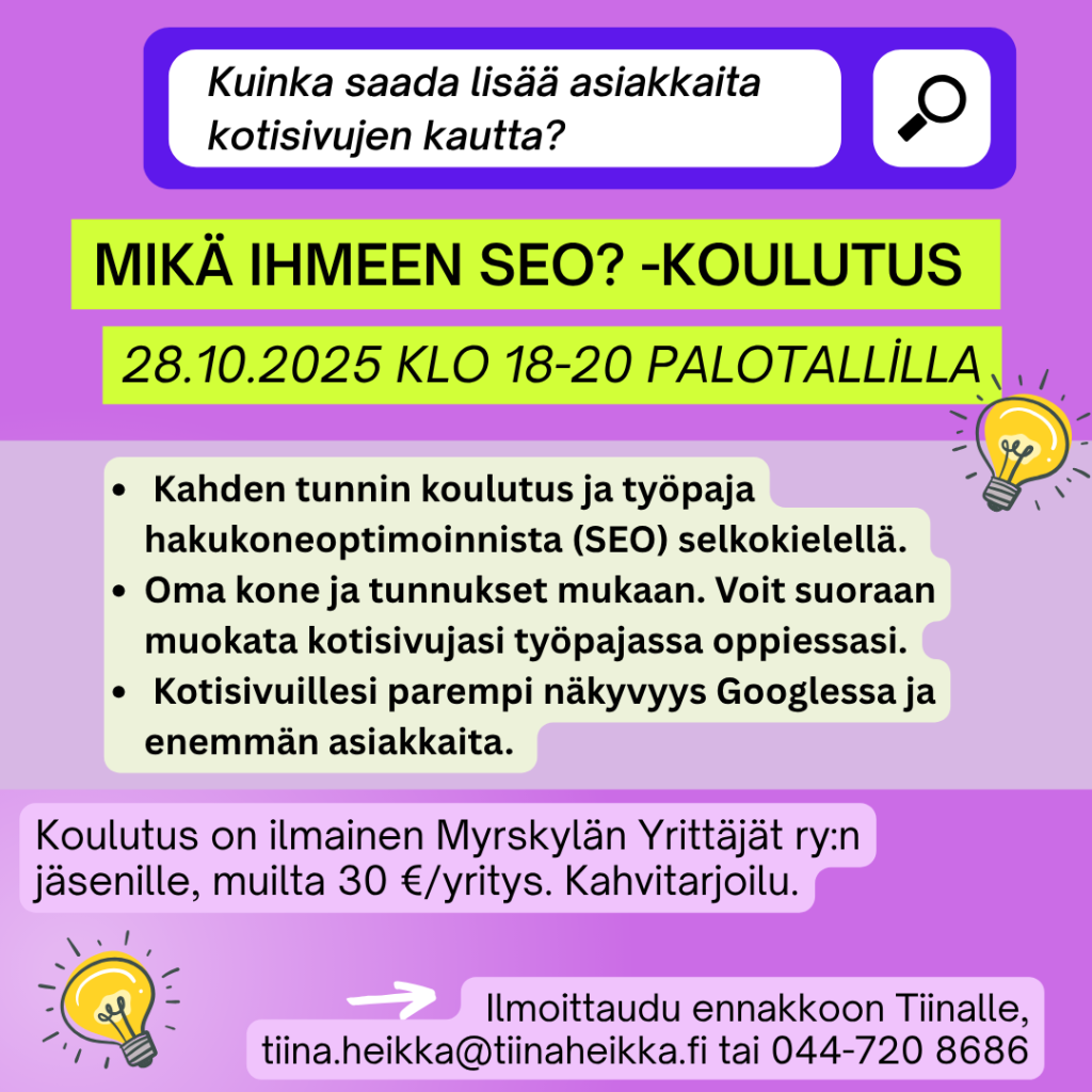 SEO koulutusta 28.10.2025 klo 18 Myrskylän palotallilla