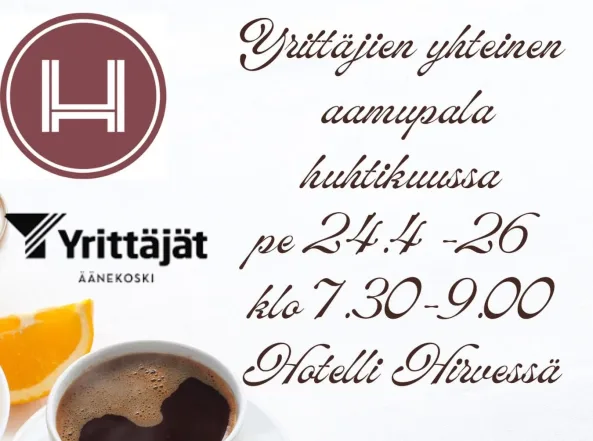 Huhtikuun yrittäjien yhteinen aamiainen pidetään Hotelli Hirvessä pe 24.4. klo 7.30-9.00.
