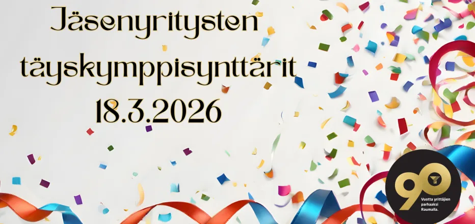 Keskiviikkona 18.3.2026 juhlitaan perinteiseen tapaan Rauman Yrittäjien jäsenyrityksiä, joilla on takana tasakymmeniä. Kaikki ne yritykset jotka vuonna 2025 ovat täyttäneet tasakymmeniä, ovat kutsuttaja tähän tilaisuuteen.