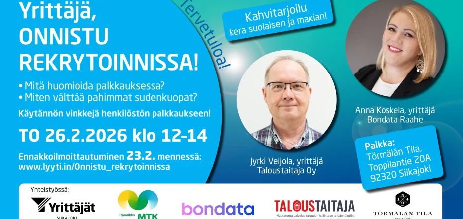 Yrittäjä, oletko palkkaamassa ensimmäistä työntekijää vai oletko jo konkari työnantajana? Olet kumpi vain, niin nyt on tarjolla käytännönläheistä sparrausta palkkaamiseen. Tule nappaamaan parhaimmat vinkit henkilöstön palkkaukseen!