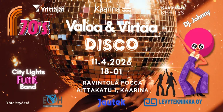 Lauantaina 11.4. kaarinalaiset yrittäjät ja kaupunki kohtaavat Ravintola Foccan parketilla peilipallojen välkkeessä ✨. Savusta nousee City Lights Funk Band ja Dj. Johnny hoitelee loppuillan.