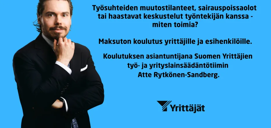 Koulutuksen asiantuntijana on Suomen Yrittäjien työ- ja yrityslainsäädäntötiimin Atte Rytkönen-Sandberg.