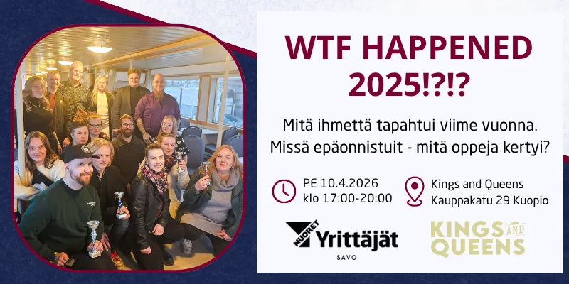 Savon Nuorten Yrittäjien WTF Happened 2025?!?! muistelee mitä ihmettä tapahtui viime vuonna. Missä tuli epäonnistumisia – mitä oppeja kertyi reppuun? Ja selviätkö vielä verokarhun syynistä?
