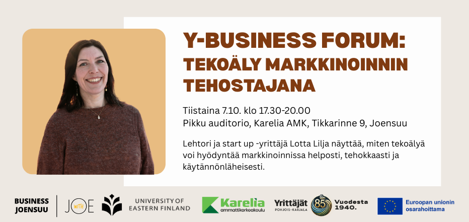 Vuoden kolmannessa Y-Business Forumissa saat käytännön oppeja tekoälyn hyödyntämisestä markkinoinnissa, kun aiheeseen johdattaa liiketalouden lehtori ja kiertotalouden start up -yrittäjä Lotta Lilja. Työpajassa opit, miten tekoäly voi tukea arjen työtä: ideoinnista sisällöntuotantoon ja somepostauksista kampanjasuunnitteluun.