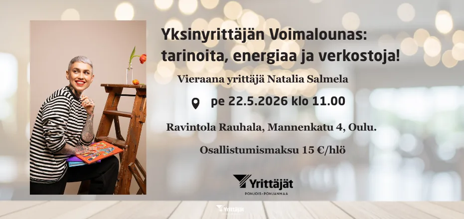 Tervetuloa Pohjois-Pohjanmaan Yksinyrittäjäverkoston järjestämään lounastapaamiseen, jossa tankataan sekä inspiraatiota että maittavaa ravintoa.