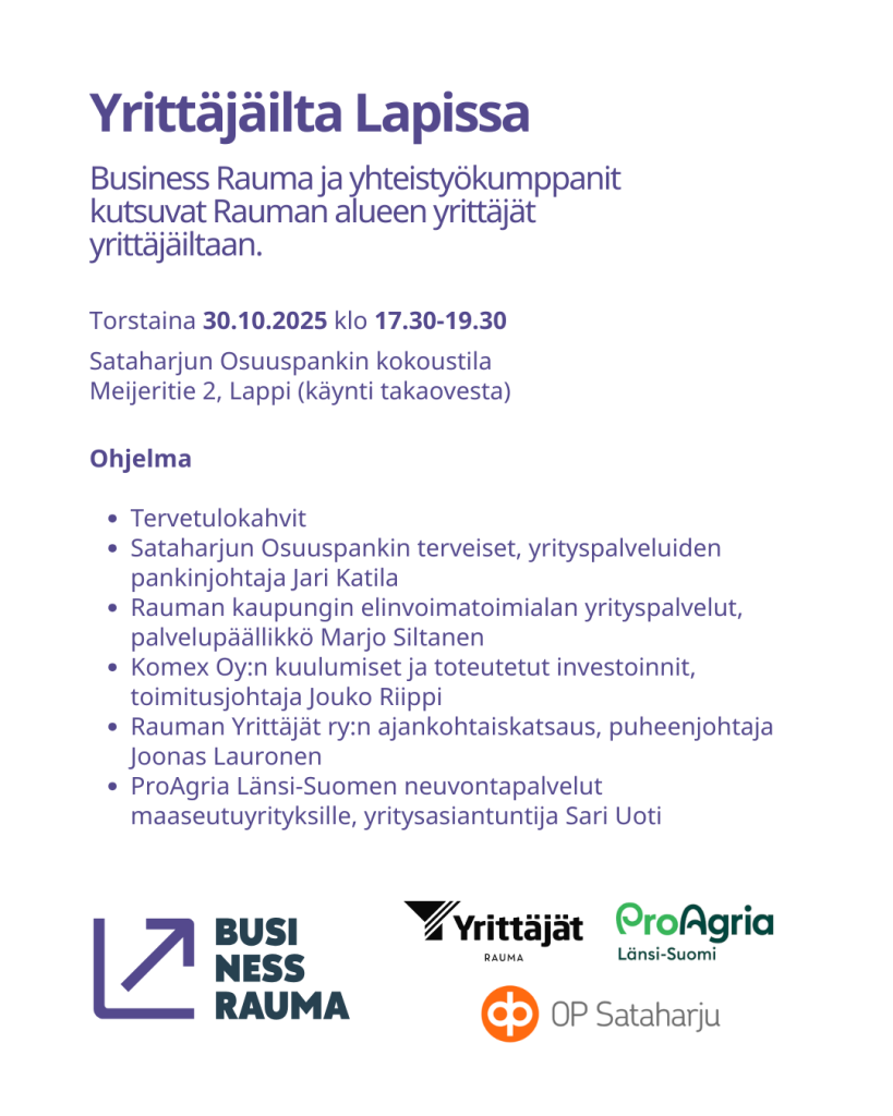 Kutsua voi välittää vapaasti eteenpäin – tilaisuus on maksuton ja avoin kaikille Rauman alueen yrittäjille.
