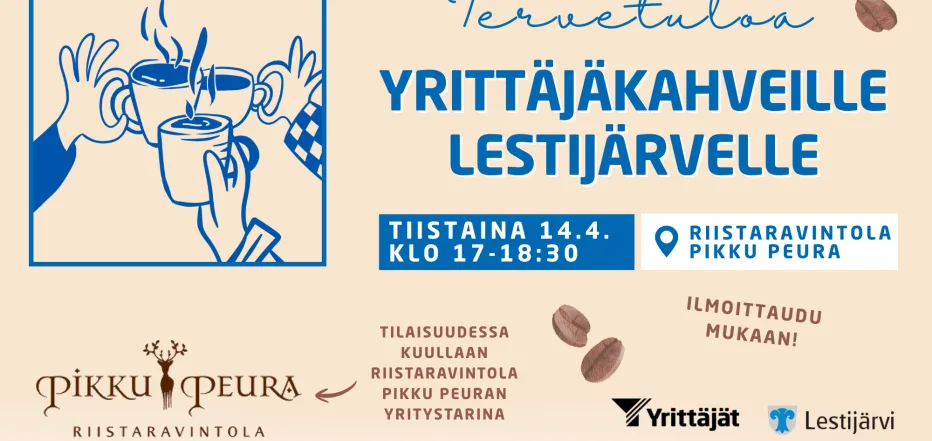 Keski-Pohjanmaan Yrittäjät kutsuu Lestijärven ja lähialueen yrittäjät Yrittäjäkahveille tiistaina 14.4.2026 klo 17.00–18.30. Tilaisuus on avoin kaikille yrittäjille.