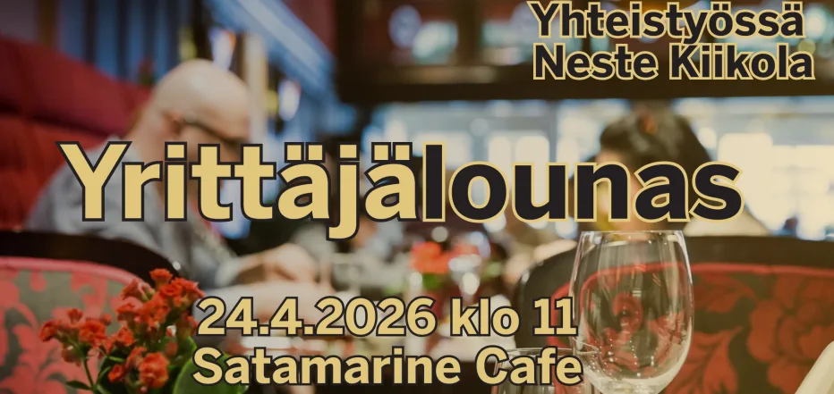 Maksuton Yrittäjälounas nautitaan perjantaina 24.4. klo 11 Satamarine Cafe:ssa. Neste Kiikolan tarjoaman lounaan lomassa voit keskustella toisten yrittäjien kanssa ja kuulla ajankohtaisia kuulumisia.