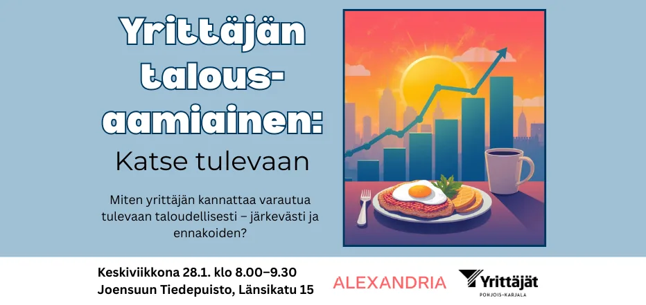 Alexandria toimii vuonna 2026 Suomen Yrittäjien pääyhteistyökumppanina. Pohjois-Karjalan Yrittäjät toivottaa sinut lämpimästi tervetulleeksi yrittäjille suunnattuun talousaamiaiseen kuulemaan, mitä yhteistyö tarkoittaa käytännössä ja millaisia hyötyjä se tarjoaa yrittäjille.