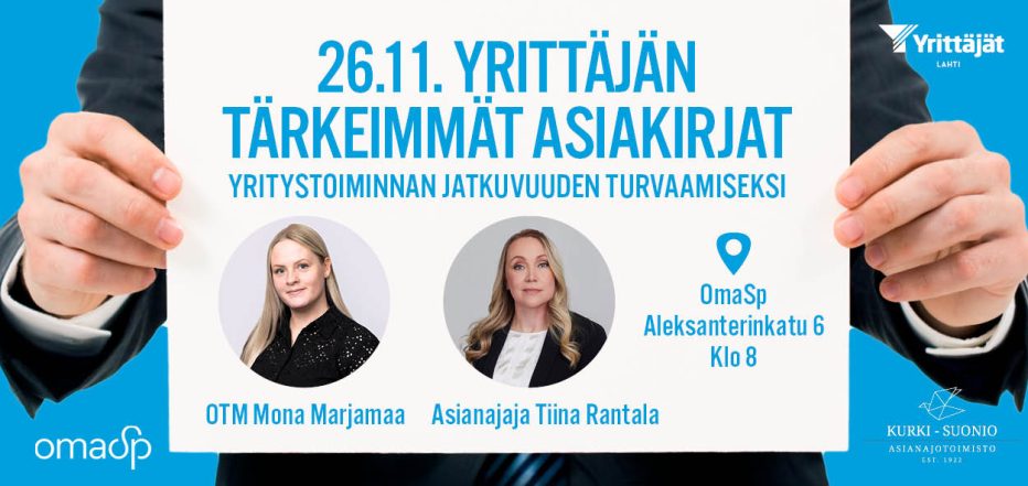 Oletko ajatellut mitä tapahtuu, jos olet estynyt väliaikaisesti tai pysyvästi hoitamaan yritystäsi tai omia asioitasi? Tule kuulemaan kun Asianajotoimisto Kurki-Suoniolta asianajaja Tiina Rantala ja juristi Mona Marjamaa kertovat miten varautua.