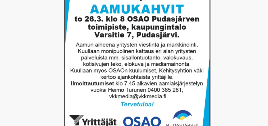 Yrittäjien AAMUKAHVIT to 26.3. klo 8 OSAO Pudasjärven toimipiste, kaupungintalo Varsitie 7, Pudasjärvi.