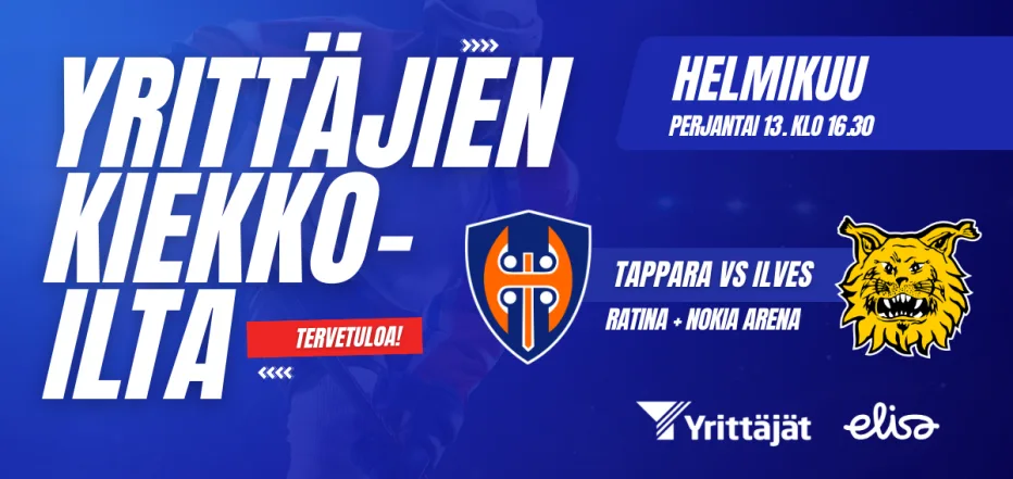 Tervetuloa mukaan verkostoitumaan ja laajentamaan omaa yrittäjäpiiriäsi jääkiekko-ottelun kera. Kokoonnumme yhteistyökumppanimme Elisan tiloihin Ratinaan ennen ottelua ruokailemaan ja verkotoitumaan.