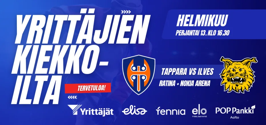 Tervetuloa mukaan verkostoitumaan ja laajentamaan omaa yrittäjäpiiriäsi jääkiekko-ottelun kera. Kokoonnumme yhteistyökumppanimme Elisan tiloihin Ratinaan ennen ottelua ruokailemaan ja verkostoitumaan klo 16.30. Kuulemme myös tapahtuman kumppanien Elisan, Fennian ja Elon sekä POP Pankki aallon puheenvuorot ruokailun lomassa.