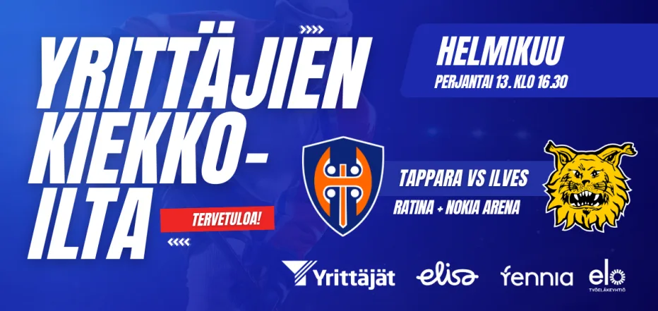Tervetuloa mukaan verkostoitumaan ja laajentamaan omaa yrittäjäpiiriäsi jääkiekko-ottelun kera. Kokoonnumme yhteistyökumppanimme Elisan tiloihin Ratinaan ennen ottelua ruokailemaan ja verkostoitumaan klo 16.30. Kuulemme myös tapahtuman kumppanien Elisan, Fennian ja Elon puheenvuorot ruokailun lomassa.