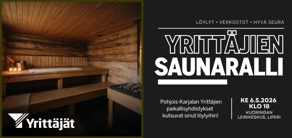 Saunaralli 2026 starttaa Kuoringan leirikeskuksessa. Pohjois-Karjalan Yrittäjien kaikki 15 paikallisyhdistystä ympäri maakuntaa kutsuvat sinut mukaan löylyihin ja makkaranpaistoon.