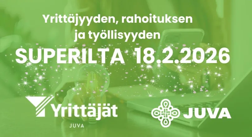 Rahoituksen, yrittäjyyden ja työllisyyden Superilta kokoaa yhteen alueen keskeiset yritys- ja rahoituspalvelut torstaina 18.2.2026 Juvan kunnanviraston valtuustosaliin. Tapahtuma tarjoaa ajantasaisen tietoiskun yrittäjille, yritystoimintaa suunnitteleville sekä työllisyyden ja elinvoiman parissa toimiville. Puheenvuorojen jälkeen on varattu aikaa kysymyksille ja verkostoitumiselle. Tilaisuuden järjestävät Juvan Yrittäjät ja Juvan kunta.