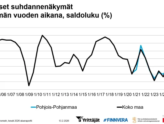 Alueraportti TÄSTÄ Aluediat TÄSTÄ Pohjois-Pohjanmaalla yleisiä suhdannenäkymiä kuvaava saldoluku on parantunut ollen nyt (+1), kun se syksyn 2025 Pk-yritysbarometrissa oli…