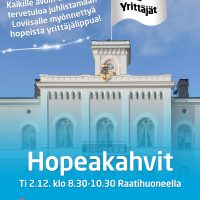 Joulukuun aamukahvit järjestää Loviisan kaupunki kaikille loviisalaisille Raatihuoneella tiistaina 2.12. klo 8.30 - 10.30. Juhlitaan yhdessä hopeista Yrittäjä-merkkiä! Tervetuloa Raatihuoneelle…