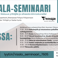 Tämä seminaari on tarkoitettu yrittäjille, kunnan viranhaltijoille, yhteistyökumppaneille, sidosryhmille ja kaikille, ketkä ovat kiinnostuneita kuulemaan, miten Vaala kehittyy ja millaisia…