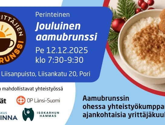 Tule verkostoitumaan ja keskustelemaan ajankohtaisista teemoista aamubrunssin merkeissä. Ajankohta:Perjantai 12.12.2025 klo 7:30 - 9:30. Paikka:Ravintola Liisanpuisto, Liisankatu 20, Pori Yhteistyössä:…
