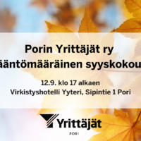 Tervetuloa Porin Yrittäjät ry:n sääntömääräiseen syyskokoukseentiistaina 12.9. klo 17! Tervetuloa Porin Yrittäjät ry:n sääntömääräiseen syyskokoukseen 12.9. klo 17 Virkistyshotelli Yyteriin!…