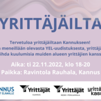 Tervetuloa yrittäjäiltaan Kannukseen! Illan aikan saat tietoa meneillään olevasta YEL-uudistuksesta, yrittäjän ansioturvasta sekä vaihda kuulumisia muiden alueen yrittäjien kanssa. Ohjelma:…