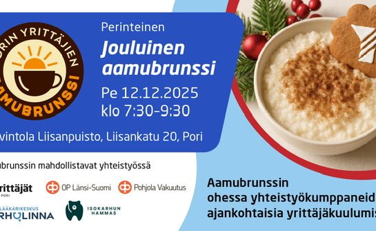 Tule verkostoitumaan ja keskustelemaan ajankohtaisista teemoista aamubrunssin merkeissä. Ajankohta:Perjantai 12.12.2025 klo 7:30 - 9:30. Paikka:Ravintola Liisanpuisto, Liisankatu 20, Pori Tilaisuudessa…