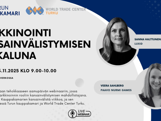 Tässä maksuttomassa webinaarissa 13.11.2025 klo 9.00–10.00 kuulet, miksi kansainvälistyminen voi olla yrityksesi salainen ase. Webinaarissa pureudumme markkinoinnin rooliin kansainvälisessä kasvussa…