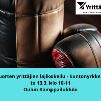 Löydä sisäinen Rocky Balboa ja tule hikoilemaan kuntonyrkkeilyn merkeissä yhdessä nuorten yrittäjien kanssa!Yhteiseen lajikoikeiluun on jokainen tervetullut taustasta riippumatta. Milloin:…