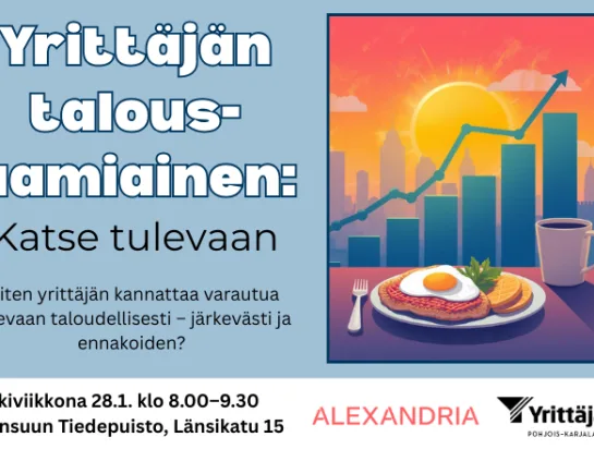 Alexandrian ja Pohjois-Karjalan Yrittäjien aamiaistilaisuus Aika: Keskiviikkona 28.1.2026 klo 8.00–9.30Paikka: Kokoustila Minerva, rakennus 4B, 1. krs, Joensuun Tiedepuisto, Länsikatu 15, 80110…
