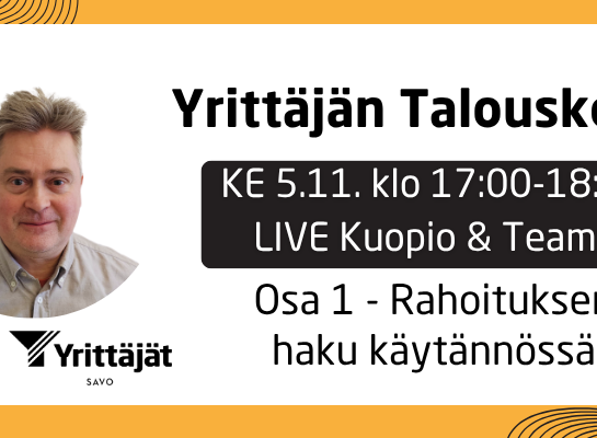 Esille nousseiden yritysten rahoitushaasteiden johdosta Savon Yrittäjät tarjoaa apua! Tervetuloa oppimaan Pekka Naumasen Yrittäjän Talouskouluun! Voit osallistua tilaisuuteen paikan päällä…