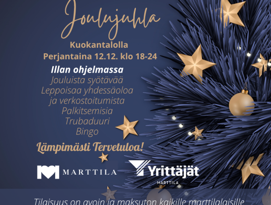 Hei marttilalainen yrittäjä, kunnan luottamushenkilö tai esittelijä! Tervetuloa mukaan yhteisiin pikkujouluihin perjantaina 12.12.2025 klo 18-24 Kuokantalolle. Ohjelmassa on luvassa jouluista…
