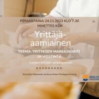 Yrittäjäaamiainen 24.11.2023 Minettes kök ravintolassa. Aamiasta tarjolla klo 7.30 ja ohjelmaa alkaa klo 8.00. Ohjelma: Malax Företagare yhdistyksen ajankohtaisia asioita…