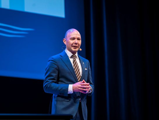 Suomen Yrittäjien puheenjohtaja Petri Salminen piti juhlapuheen lauantaina Varsinais-Suomen Yrittäjägaalassa Logomossa.