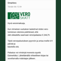 Verohallinnon nimissä on taas liikkeellä huijausviestejä. Sähköpostitse leviävässä kömpelössä viestissä kerrotaan 244,79 euron veronpalautuksesta.